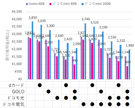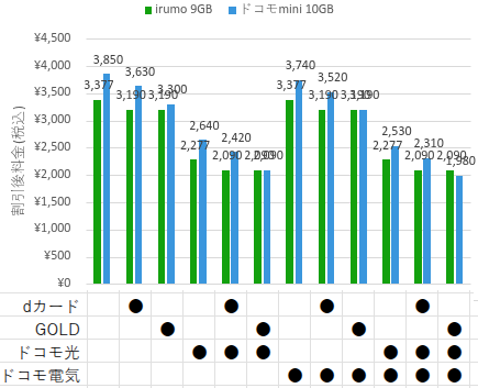 【適用割引ごとの月額料金 – irumo 9GB vs ドコモmini 10GB】