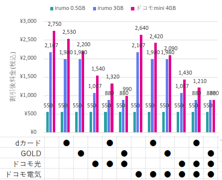 【適用割引ごとの月額料金 – irumo 0.5GB/3GB vs ドコモmini 4GB】
