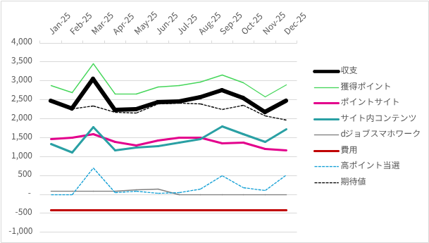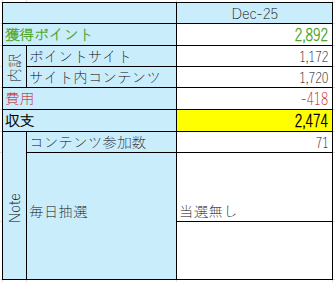 2025年12月の実績は以下の通りです。※サイト内コンテンツの抽選系ミッションの結果は一部未反映です。