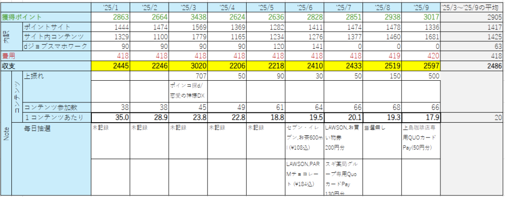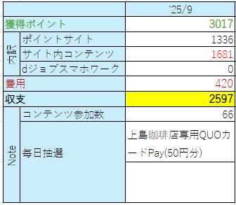 2025年9月の実績は以下の通りです。(’25/9/30 サイト内コンテンツのポイント抽選系ミッションの結果は一部未反映。)