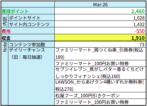 - 2026年3月の獲得ポイントは1,028ptでした。これは筆者が記録を始めた2025年1月以降で最も少ない結果でした。