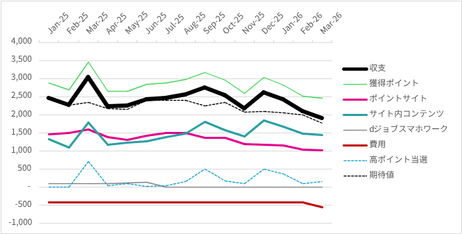 dバリューパスのキャンペーン参加や、ポイントサイト経由での獲得ポイントを毎月記録しています。本記事では、最新月の獲得ポイントと支出のバランス、過去からの推移を整理し、実際にどれだけプラスになるのかを可視化しています。