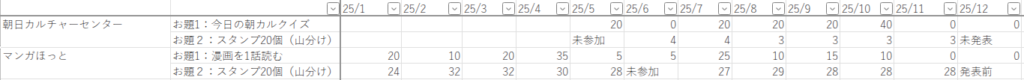 「マンガほっと」のお題1は12ヶ月で当選31回(5×31=155ポイント)、お題2は平均28.6ポイント/月でした。