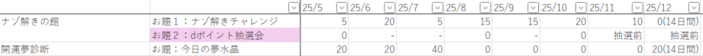 「ナゾ解きの館」と「開運夢診断」の獲得ポイント実績