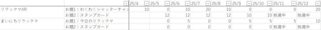 「リラックマAR」のお題1は平均7.8ポイント/月、お題2は一口あたり5〜6ポイントです。